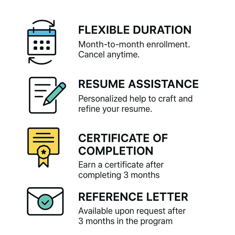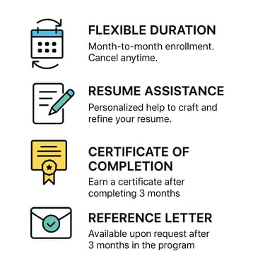 Flexibility: Month-to-month subscription offers the freedom to join and leave the program as needed, accommodating varying schedules.